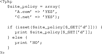 A sample soma-approval script, written in PHP, is shown in Figure 3. This script uses an array to store policy information at the top of the file then outputs the policy as requested, defaulting to NO if no policy has been defined. In this example, A.com and C.net are the only approved domains.